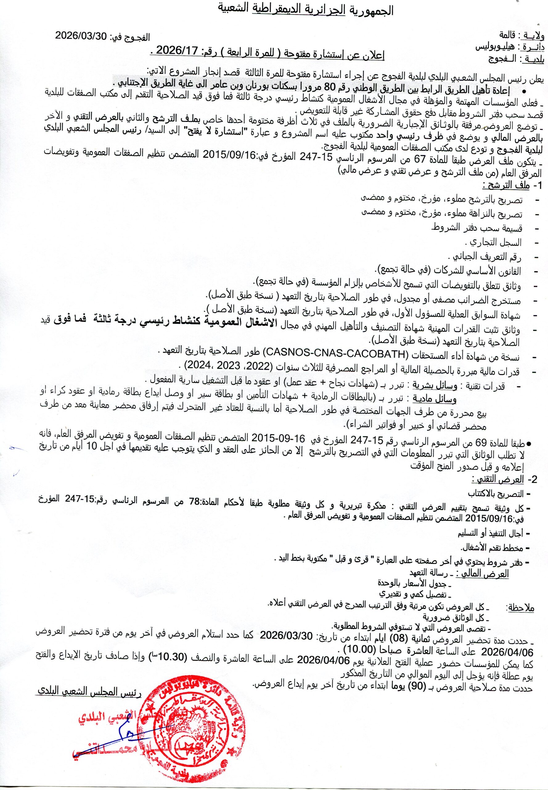 الهيئة :المجلس الشعبي البلدي لبلدية الفجوج مدة تحضير العروض : 08 أيام النوع: استشارة مفتوحة تحميـــــــــــــــــــــل