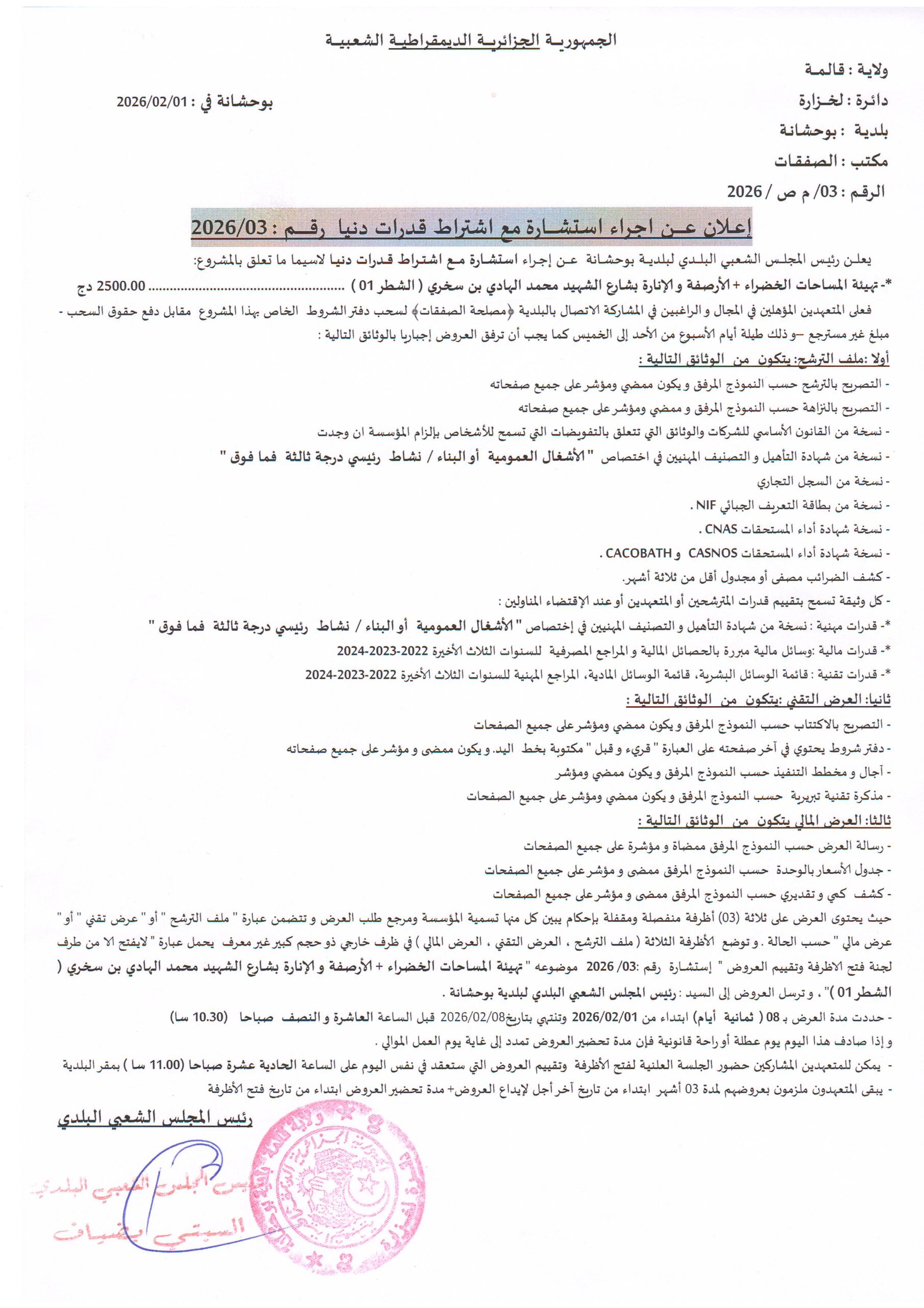 اعــــلان عن اجراء استـــشارة مع اشتراط القدرات الدنيا رقـــم 03/ 2026