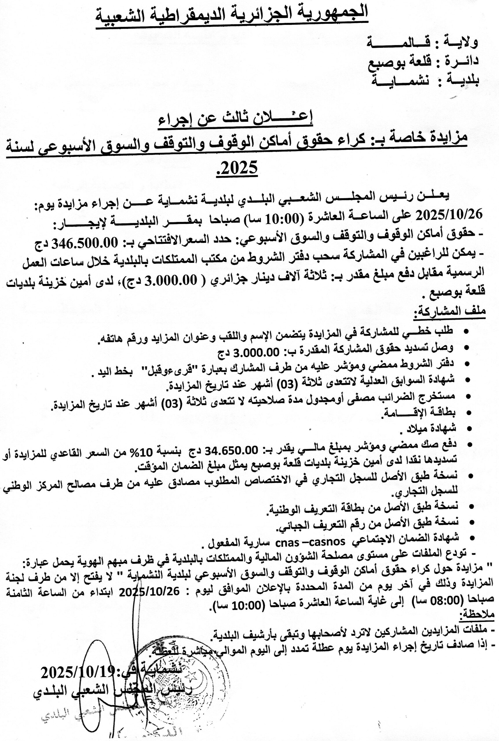 اعلان ثالث عن اجراء مزايدة خاصة بكراء حقوق اماكن الوقوف والتوقف والسوق الاسبوعي لسنة 2025
