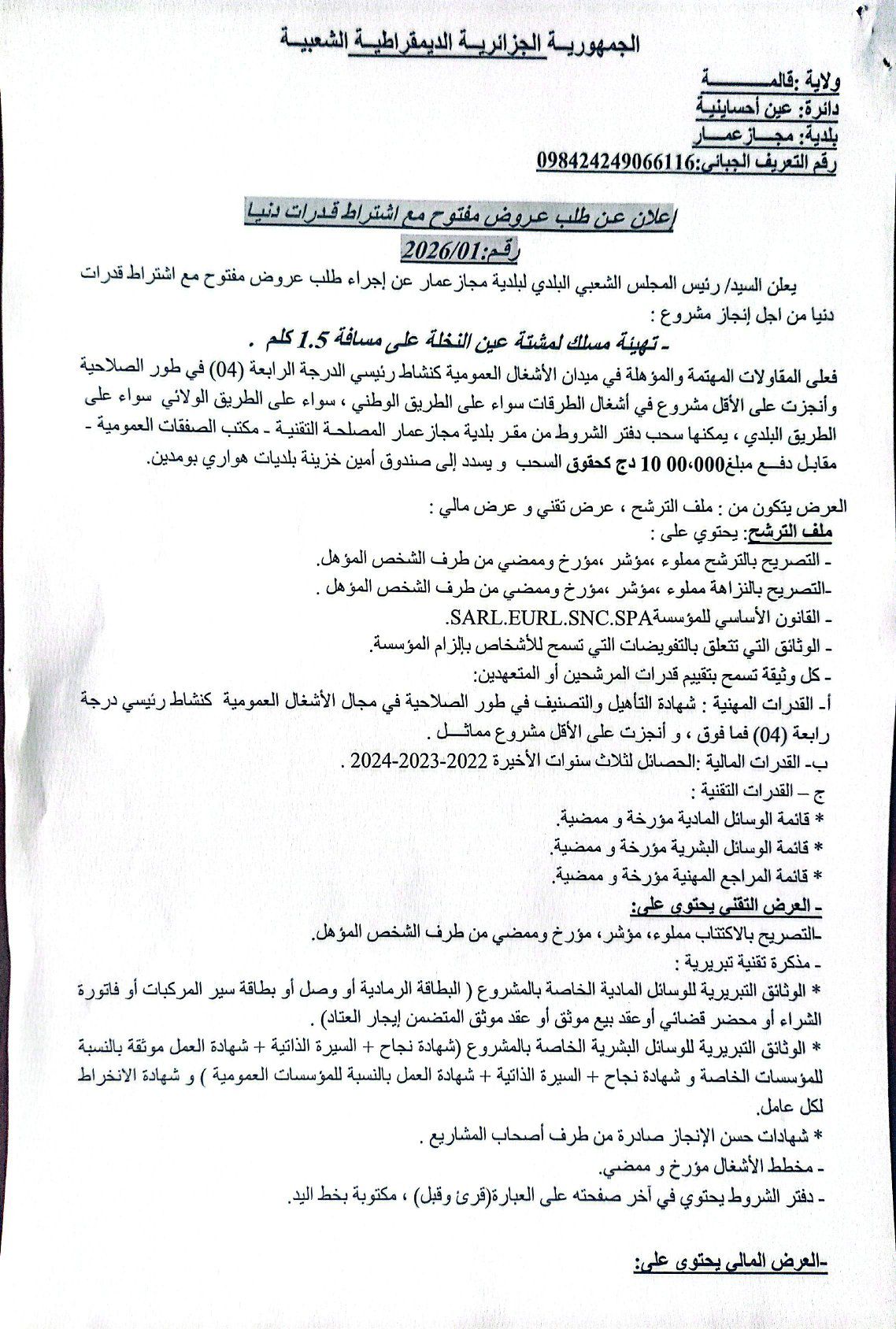 الهيئة :المجلس الشعبي البلدي لبلدية مجازعمار مدة تحضير العروض : 15 أيام النوع: استشارة تحميـــــــــــــــــــــل