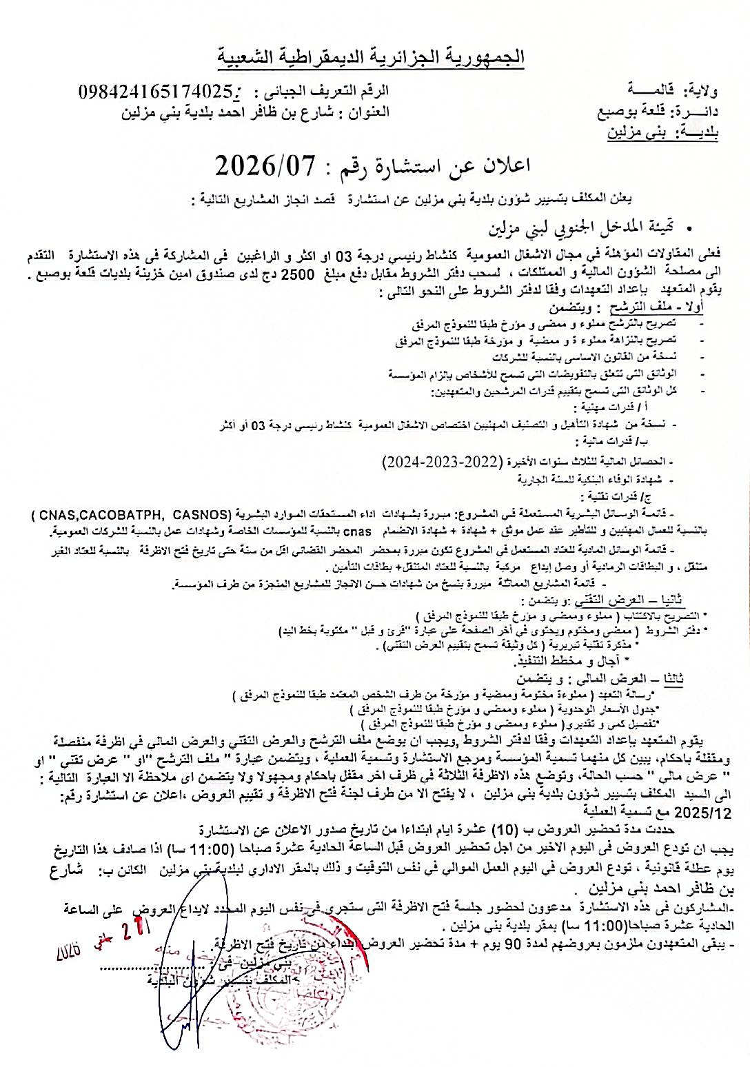 الهيئة :المجلس الشعبي البلدي لبلدية بني مزلين مدة تحضير العروض : 10 أيام النوع: استشارة تحميـــــــــــــــــــــل
