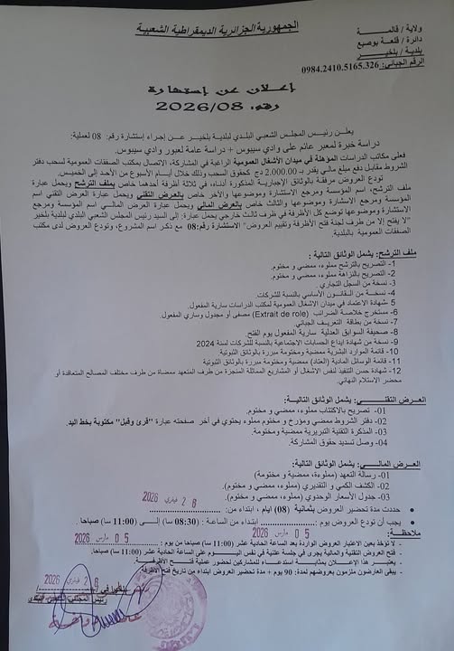الهيئة :المجلس الشعبي البلدي لبلدية بلخيــر مدة تحضير العروض : 08 أيام النوع: استشارة تحميـــــــــــــــــــــل
