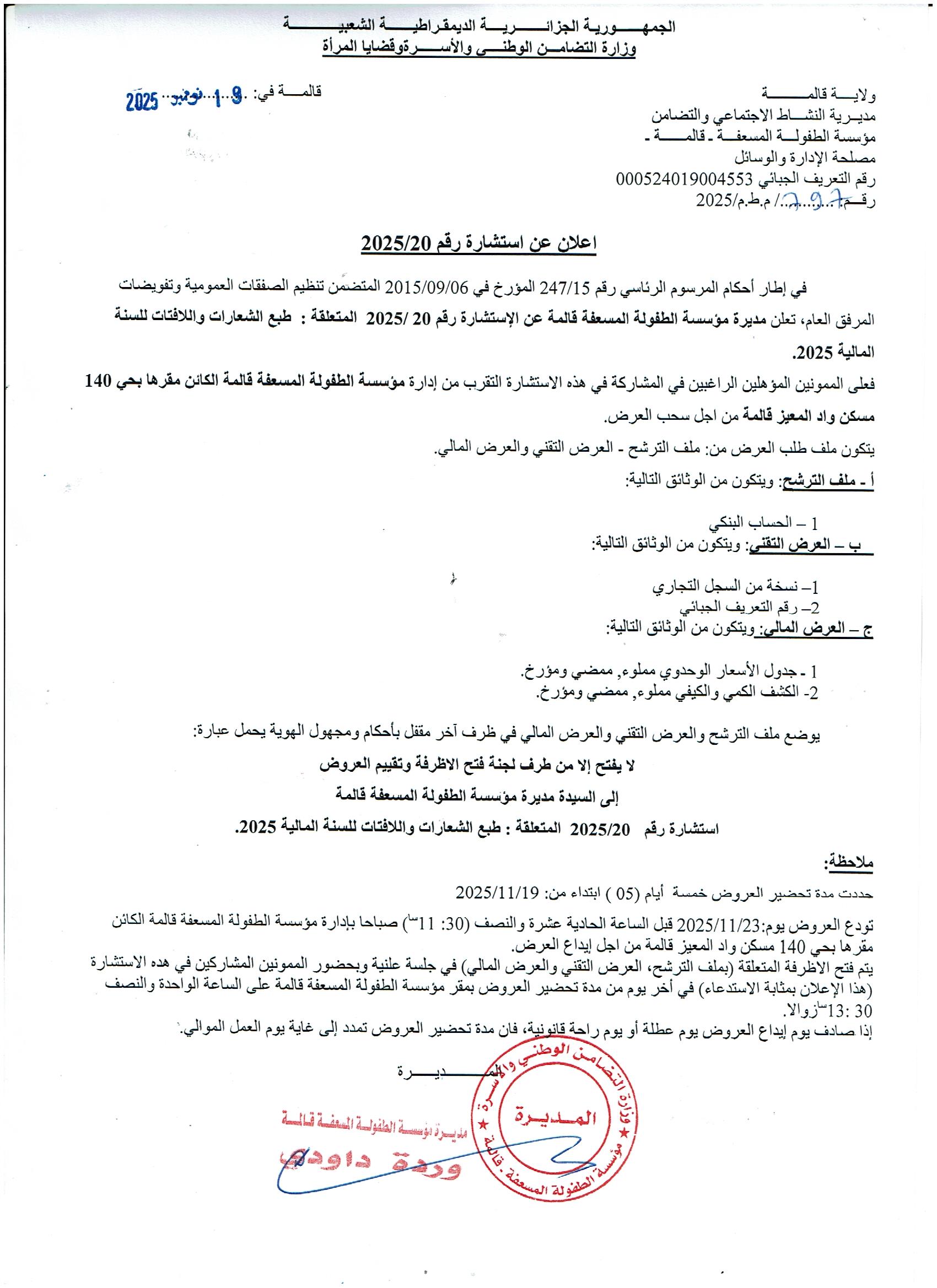 اعلان عن استــــشارة رقم 20/ 2025